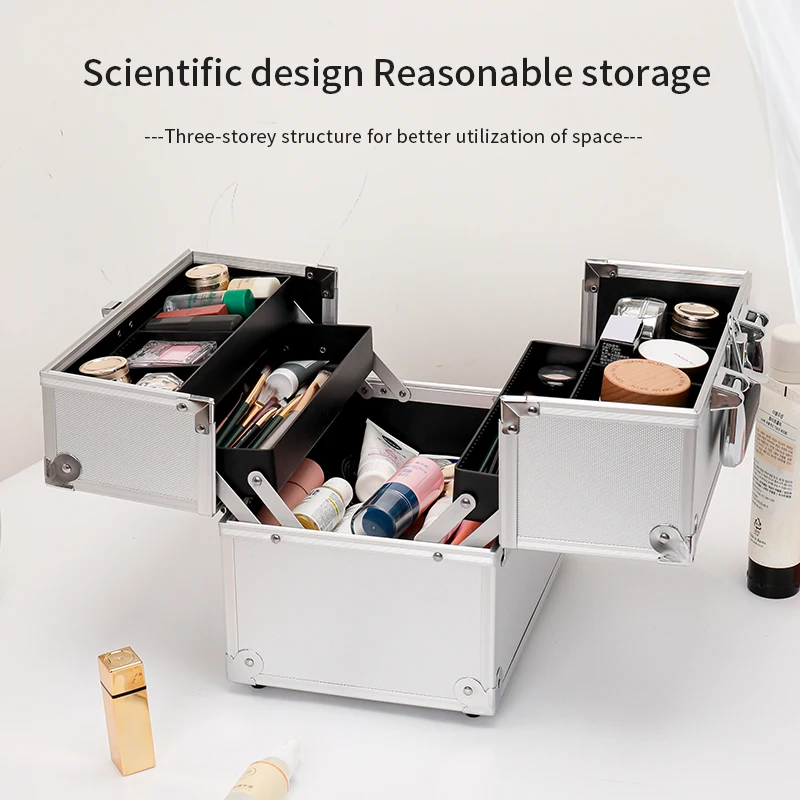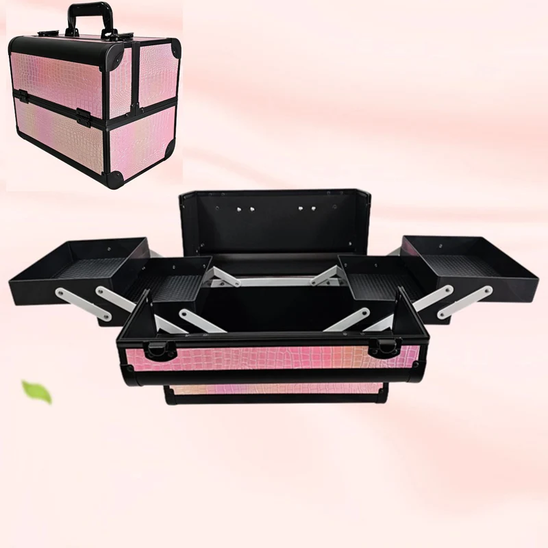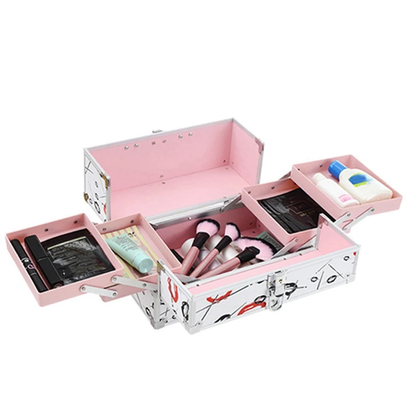 Cosmetic Box Makeup Train Case Beauty 4 Tier Trays Jewelry Storage Organizer with Lockable Pink Lining Perfect for Women Girl