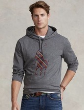 Attributes: Hooded t-shirt, long sleeve, graphic tee, lightweight hoodie, cotton, Polo Ralph Lauren. Design: Pullover hood, long sleeves, front Polo Ralph Lauren multi-player graphic, signature script logo.