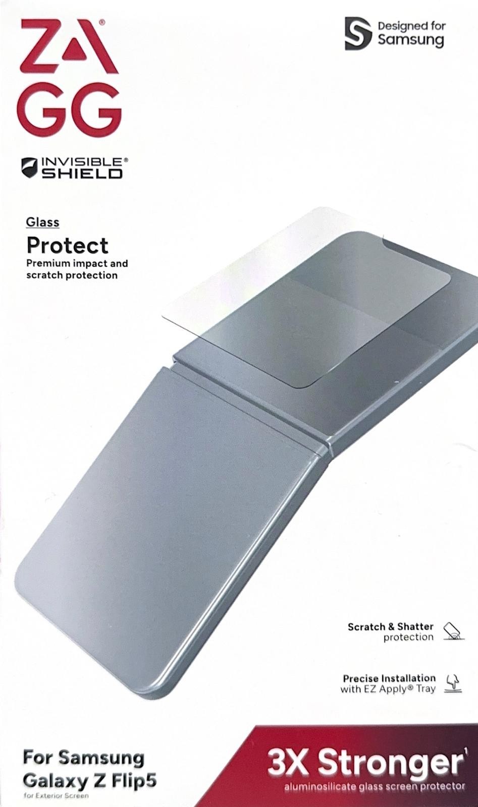 The product is a lot of 100 ZAGG Invisible Shield screen protectors specifically designed for the Samsung Galaxy Z Flip5. These clear, transparent protectors are made of tempered glass and feature anti-scratch properties, providing advanced protection for the device's screen. They are specifically designed for the Samsung Galaxy Z Flip5 model, ensuring a perfect fit and easy installation. This bulk lot of screen protectors offers peace of mind and convenience for keeping the phone's screen in top condition.
