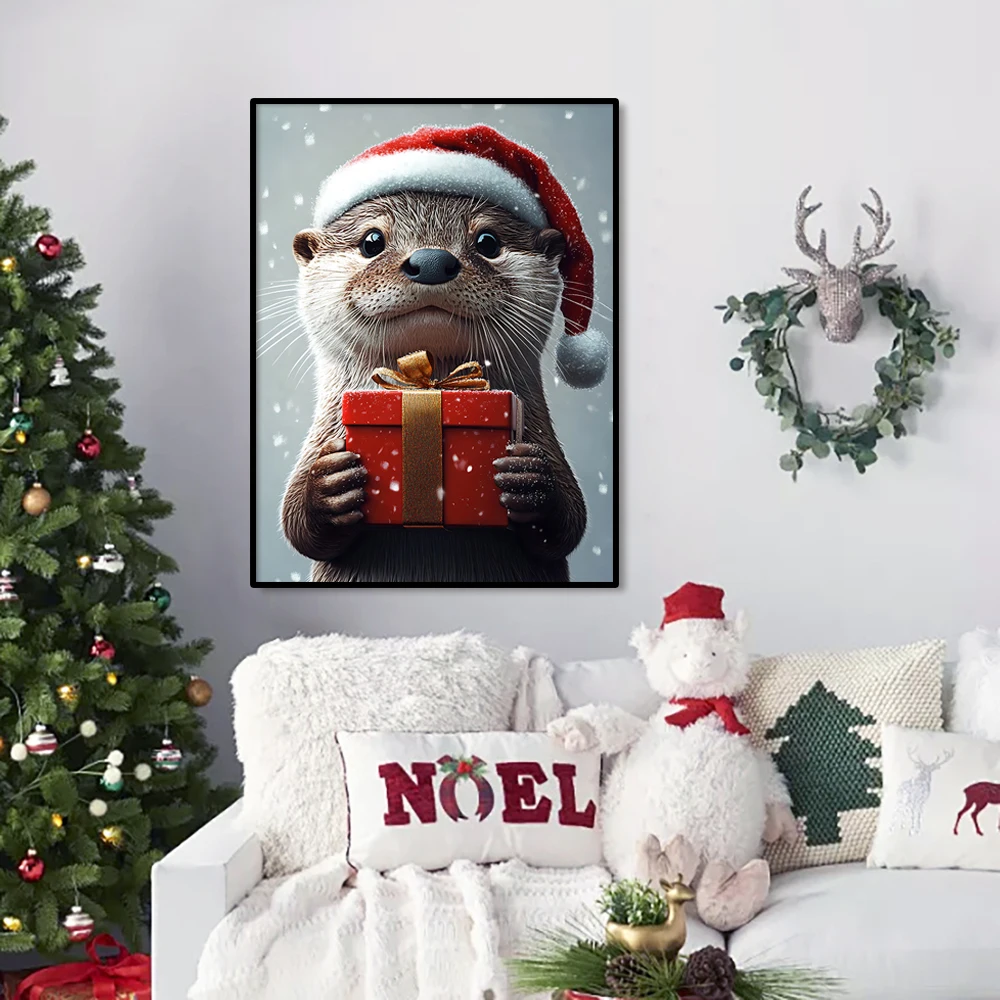 MINISO Adorable Otter Holding Christmas Gift Poster Print Winter Christmas Animal Illustration Modern Stylish Home Living Roo
