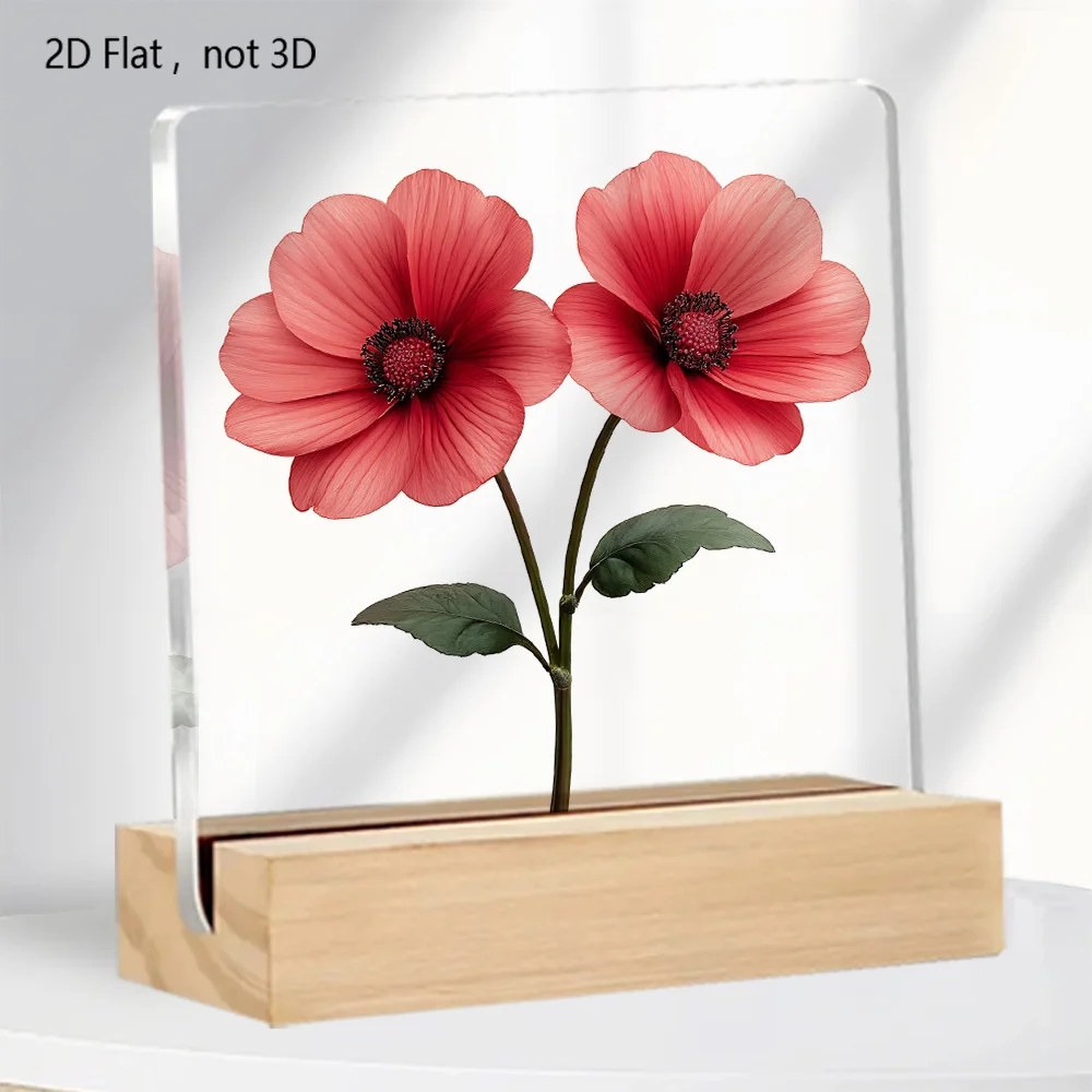 2D flat, elegant pink flowers and green leaves acrylic tabletop decoration with sturdy wooden support - home and office gift