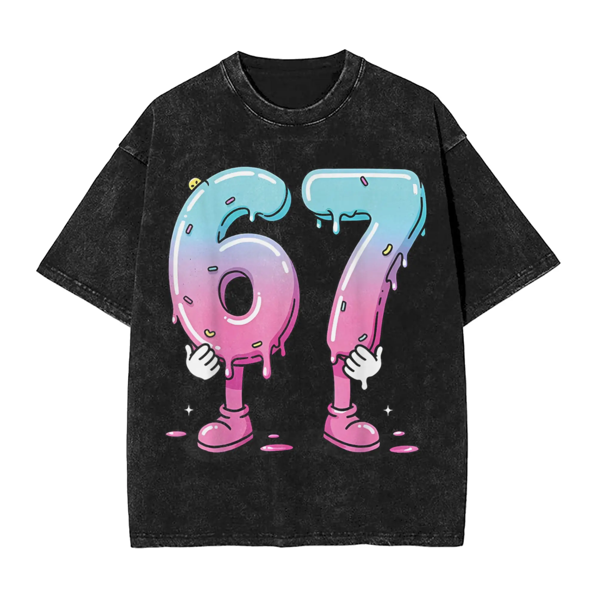 Harajuku Washed T-Shirt 67 Ice Cream Drip 67th Birthday Six Seven Meme Loose T-Shirts Fashion Tshirt Men Summer Casual Tops