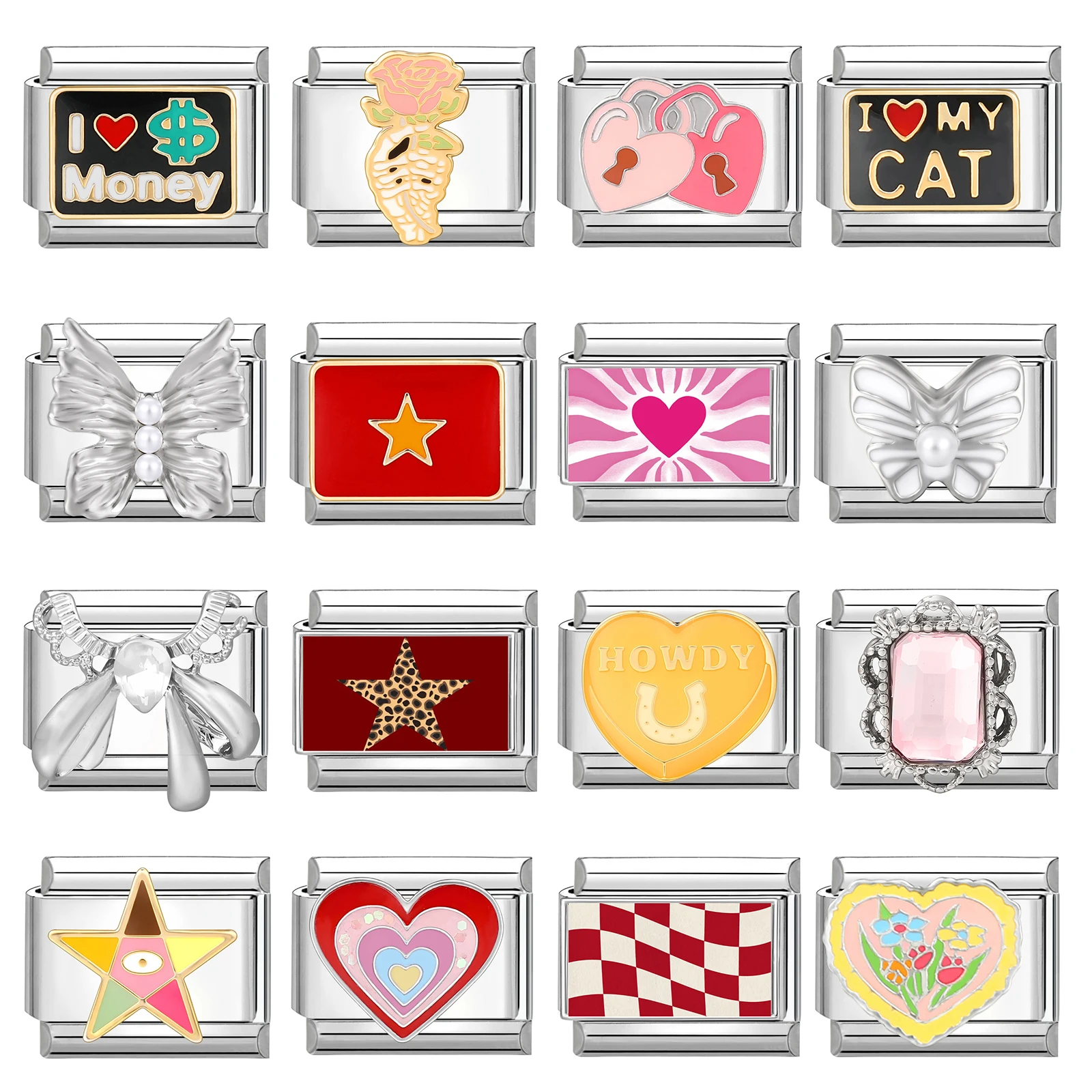Y2K Star Cow Dog Cat Paw Wings Cake Flowers Italian Charm Links Fit 9MM Stainless Steel Bracelet Women Men DIY Making Gift