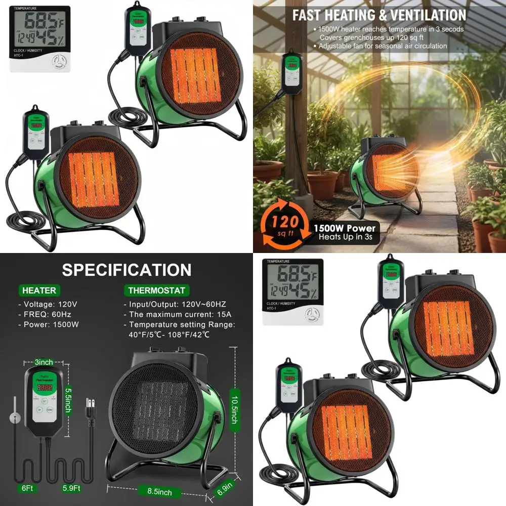 Dual-Mode 1500W/750W Plant Heater with Thermostat & Hygrometer, 24W Fan, 40-108°F Adjustable, Outdoor/Indoor Patio Heaters (Gree