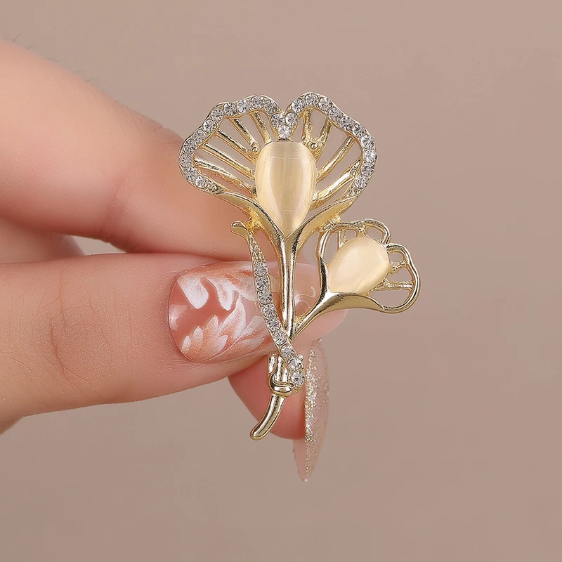 Fashion Temperament Cat Eye Stone Ginkgo Leaf Brooches For Women Clothing Coat Jewelry Accessries