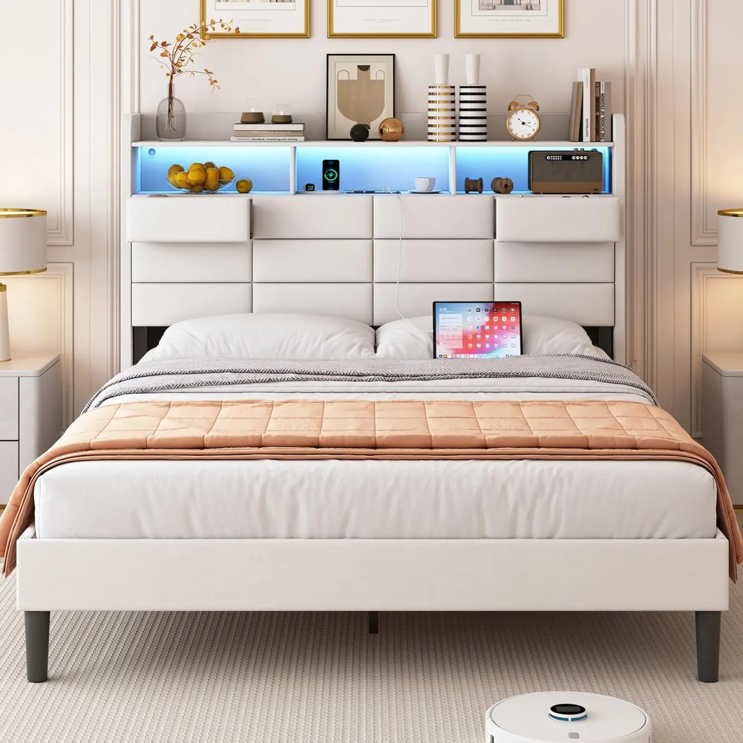 LED Bed Frame Queen Size With Storage Headboard, 2 Hidden Drawers And Charging Station, Velvet Bed Frames With Led Lights, Woode