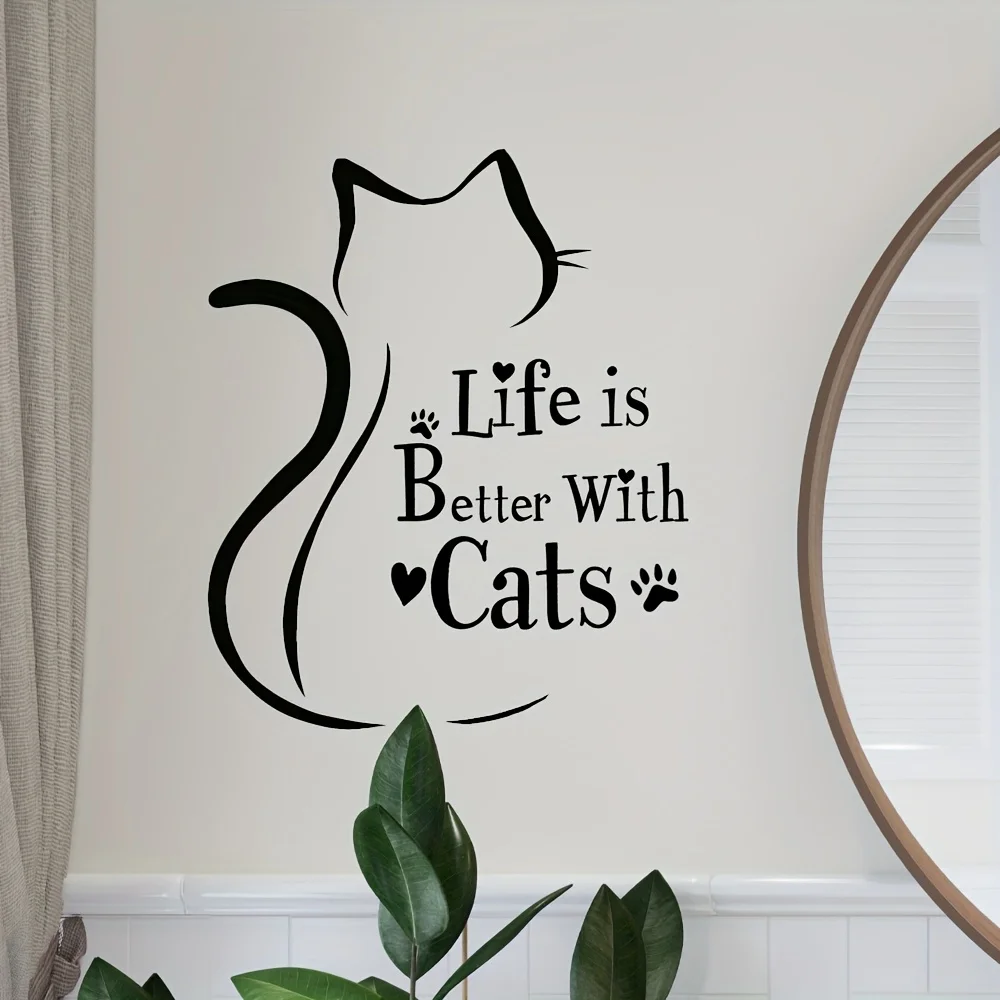 1 Cat Silhouette Wall Sticker - "Life Is Better with Cats" Quote, Glossy Surface with Paw Print Design, Fun Decoration for Cat Lovers