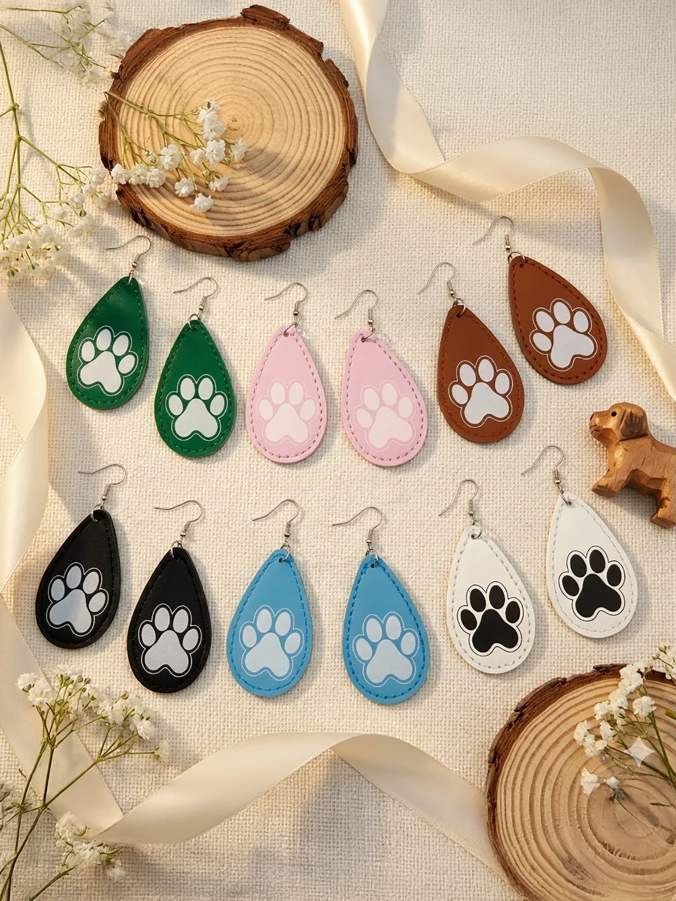 6 Pairs/Set, Simple and Stylish Women's Earring Set, Cute Cartoon Paw Print Double-Sided Printed Earrings, Composite Thickened Edge-Sealed Exquisite Water Drop Design Women's Earrings, Pu Material, Lightweight and Easy to Carry, Suitable for Daily Gifting and Celebrating Holidays, Exclusive for Pet Lovers