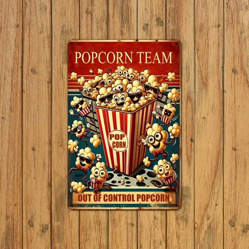 "Popcorn Team" Metal Wall Sign Vintage Tin Art Retro Cartoon Home Decor for Living Room Bedroom Kitchen Bar Cafe