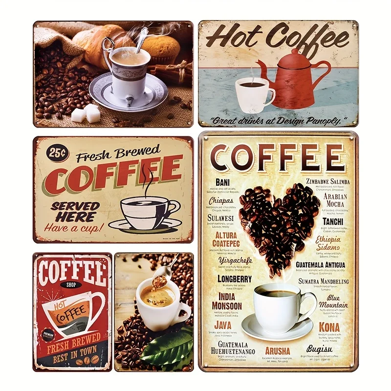 6-Piece Coffee-Themed Metal Tin Sign Set, Vintage Cafe & Kitchen Wall Decor Plaques, No Electricity Required, Home Art Poster