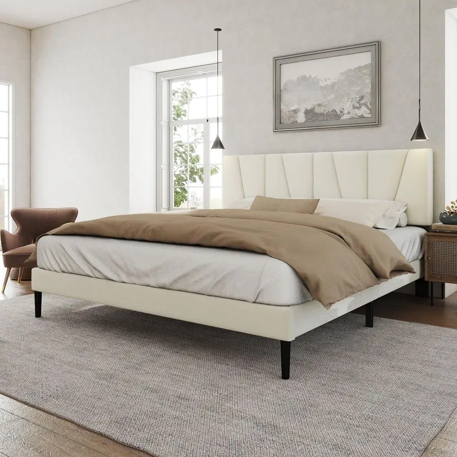 Size Bed Frame with Fabric Upholstered Headboard, Platform Bed with Wooden Slats Support, Fully Mattress Foundation, Box Spring