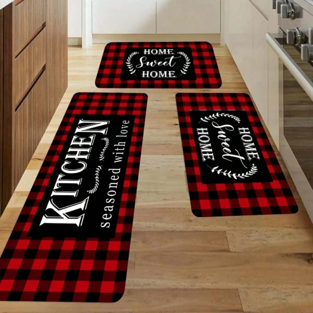 Letter & Plaid Red Bottom Kitchen Rug Bathroom Doormat Bedroom Carpet Floor Mat for Entrance Living Room Laundry Home Decor