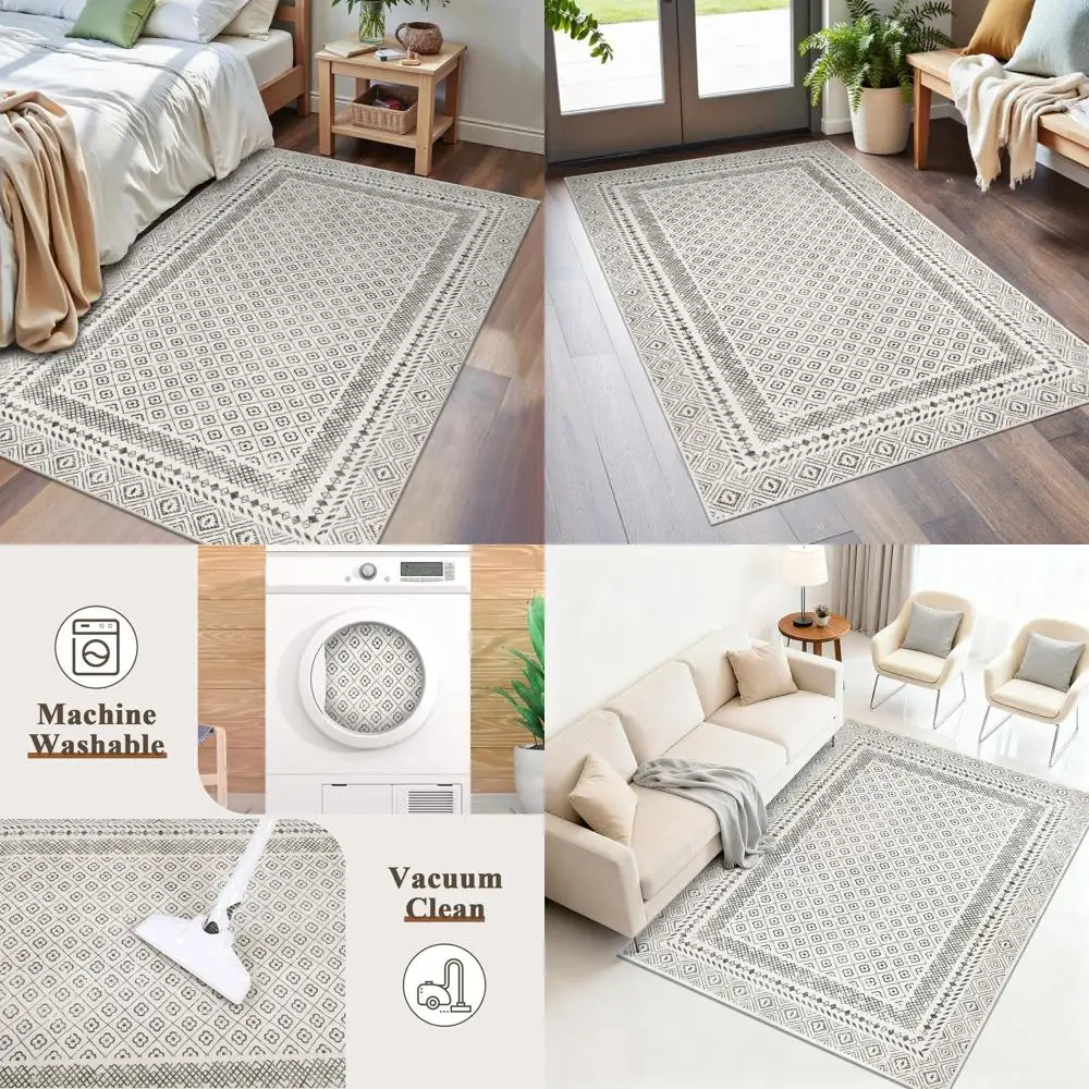 Moroccan-Style Geometric Area Rug, Low Pile, Non-Slip, Washable, Suitable for Living Spaces, Beige and Gray